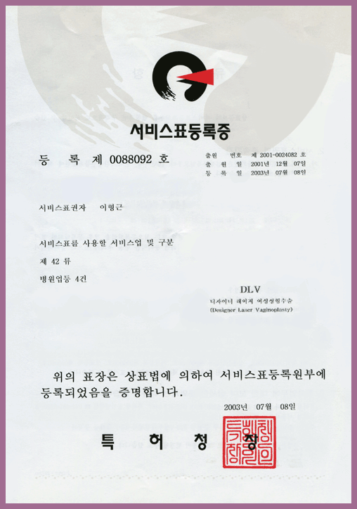 고객님께서 믿고 선택하신 『DLV™(Designer Laser Vaginoplasty™)』, 즉 디자이너 레이저 여성성형 수술은 대한민국 특허청에 정식 등록된 상표로, 안전하고 신뢰할 수 있는 레이저 소음순 성형 수술입니다.