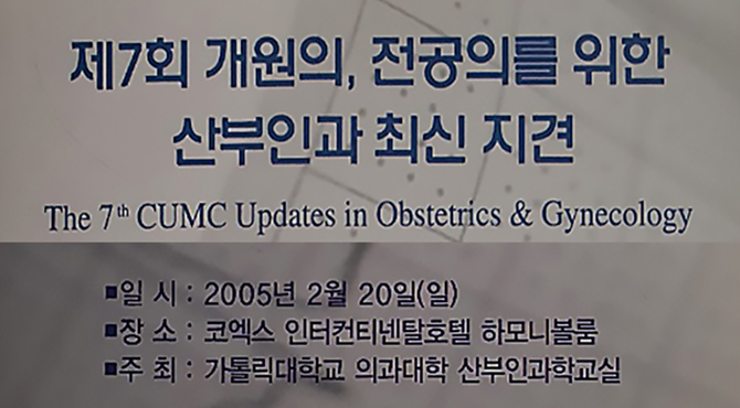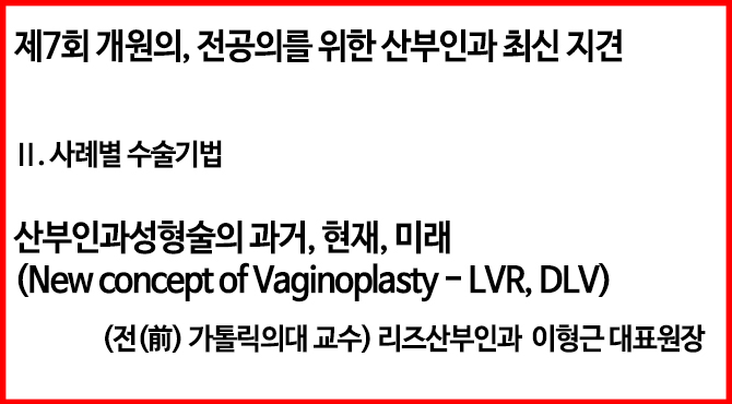제7회 개원의, 전공의를 위한 산부인과 최신 지견 2005. 02. 20. 코엑스 인터컨티넨탈 호텔 하모니볼룸 주최 : 가톨릭대학교 의과대학 산부인과학교실 리즈산부인과 이형근 대표원장님께서 연수강좌에 초청되어 강의를 하였습니다. Ⅱ. 사례별 수술기법 산부인과성형술의 과거, 현재, 미래 (New concept of Vaginoplasty - LVR, DLV) - (전(前) 가톨릭의대 교수) 리즈산부인과 이형근 대표원장