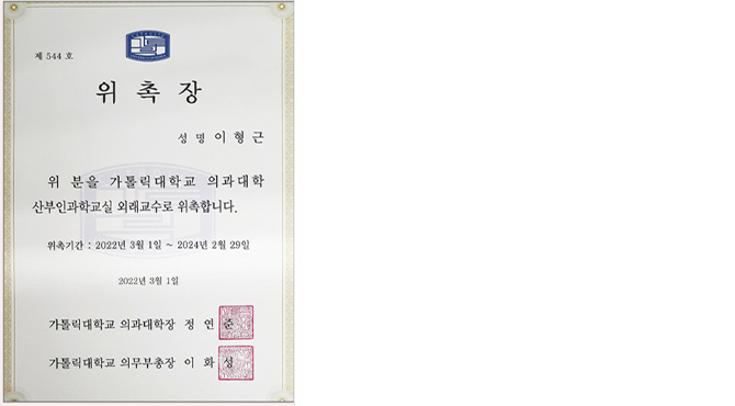 리즈산부인과 대표원장 이형근 박사 가톨릭대학교 의과대학 산부인과학교실 외래교수 위촉