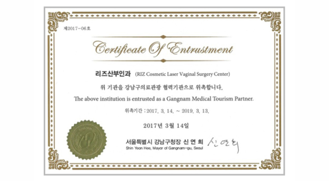 리즈산부인과 강남구 의료관광 협력기관 재위촉, 강남구청장 신연희 증서
