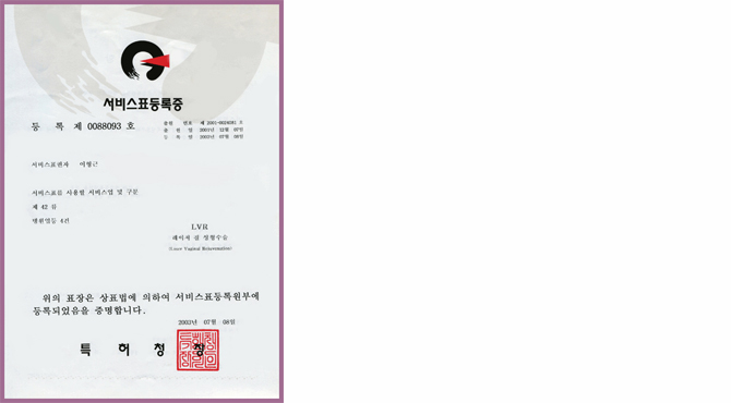 특허등록 제 88093호 갱신 완료. LVR™ (Laser Vaginal Rejuvenation™) 레이저 질 성형수술™