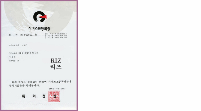 특허등록 제 120101호 갱신 완료. 리즈(RIZ)™
